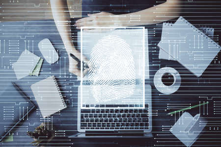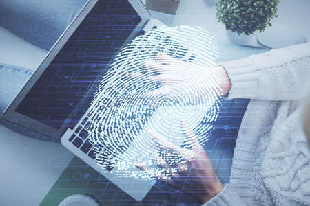 Double exposure of woman hands working on computer and fingerprint hologram drawing. Top View. Digital Security concept.