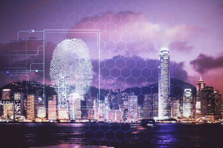 Abstract virtual fingerprint hologram on office buildings background. Multiexposure