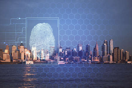 Double exposure of finger print hologram and cityscape background. Concept of personal security.