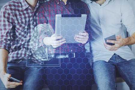 Double exposure of man's hands holding and using a digital device and fingerprint hologram drawing. Security concept.