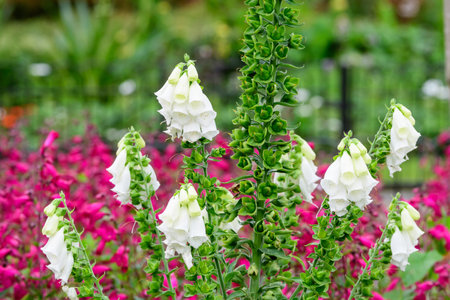 Close up of white flowers of Digitalis plant, commonly known as foxgloves, in full bloom and green grass in a sunny spring garden, beautiful outdoor floral background photographed with soft focus
