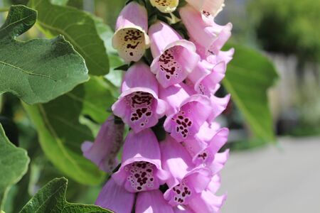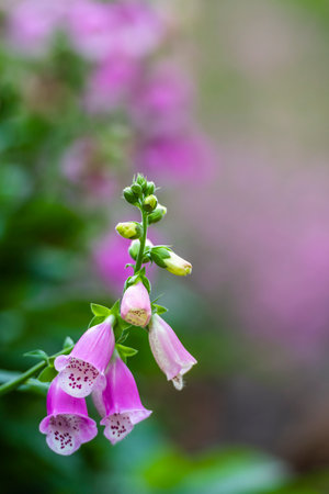 Purple foxglove Digitalis purpurea with mauve flowers with purple spots. Amazing flower background