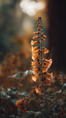 The Foxglove in fall, warm amber light, crisp air, shallow depth of field, soft natural bokeh, true to life color, minimal styling.