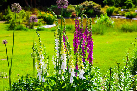 Colorful foxglove flowers blossomed in a park in spring.