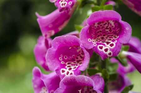 Vibrant closeup shots of purple foxglove, Digitalis purpurea, flower heads with unique spots