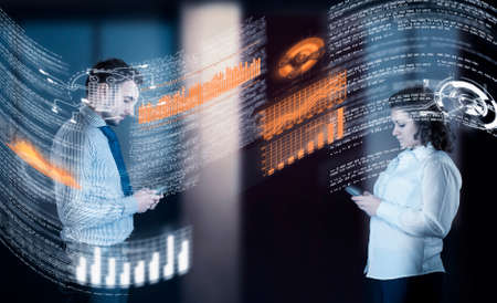 Two research and development specialists brainstorming on project to create a new approach to develop software to improve business . Working with phone. Tech hologram icons. Formal wear.