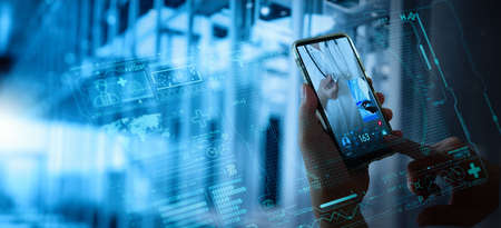 businessman hand pick mobile smartphone device with internet market social network concept, data machine deep learning, cloud storage server online, technology digital privacy, system of cyber connecting