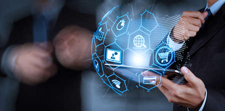Designer Businessman hand using smart phone,mobile payments online shopping,omni channel,digital tablet docking keyboard computer in modern office on wooden desk,virtual interface icons screen
