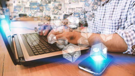 Close-up hands with laptop during online working. Double exposure - icons, connections and schematic representation of the global communication network Internet.