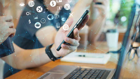 Co worker Designer hand using mobile payments online shopping,omni channel,in modern office wooden desk,icons graphic interface screen,eyeglass,filter
