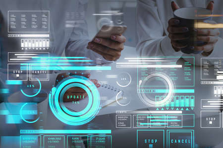 Two businesswoman wearing white shirts are working together, drinking coffee and surfing smartphone. Office in the background. Digital interface with words update and system in the foreground