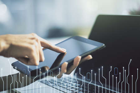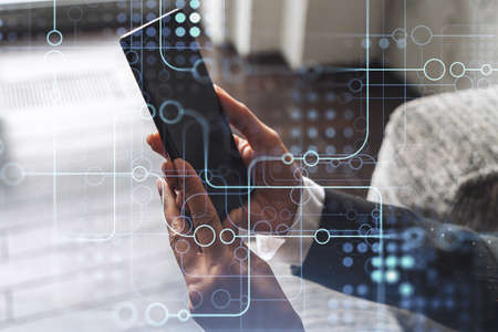 Double exposure of man's hands holding and using a digital device and tech theme hologram drawing. Technology concept.