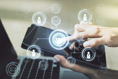 Double exposure of social network sketch hologram and woman holding and using a mobile device.