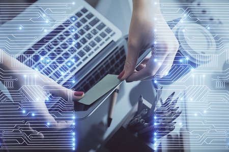 Double exposure of woman hands typing on computer and technology theme drawing. High Tech concept.