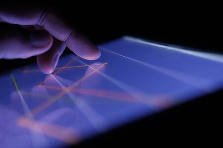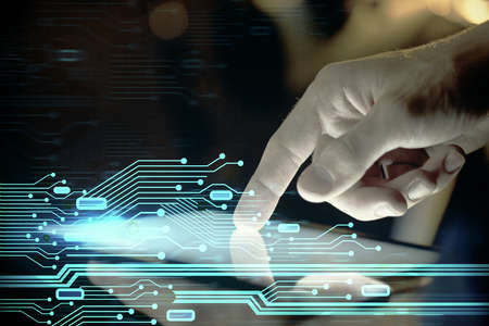 Double exposure of circuit hologram and finger clicks on a digital tablet on background. Research and development hardware concept