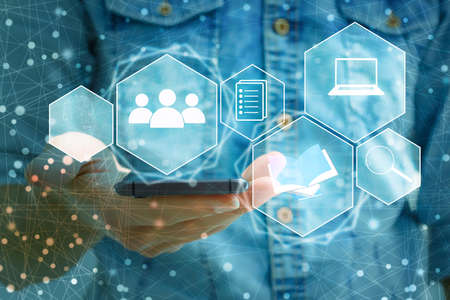 man using holding smartphone and touching virtual screen with technology icons, technology and online functions concept, internet and applications