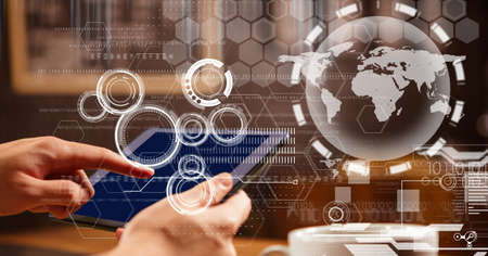 Interface showing globe information and scopes with hands of person using tablet. global communication technology digital interface concept, digitally generated image.