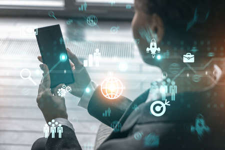 Double exposure of tech icon hologram and woman holding and using a mobile device. Technology concept.