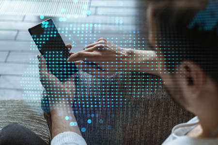 Double exposure of World map drawing hologram and a man searching information on phone in internet.