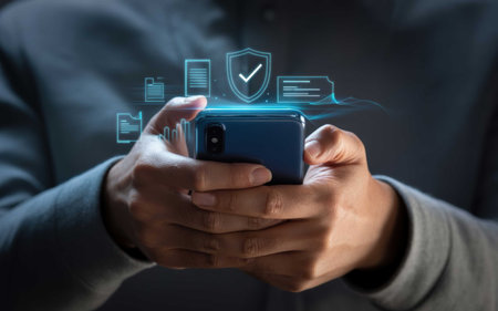 A person using a smartphone displaying a security icon, with multiple devices in the background showing cybersecurity interfaces, emphasizing data protection.