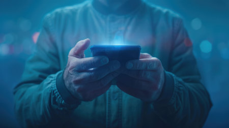 A close-up of a hand holding a glowing smartphone in a dark environment, showcasing modern technology and digital interaction.