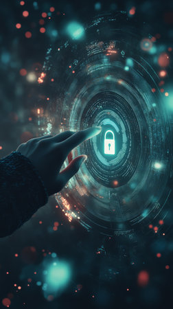 Hand pointing at a glowing padlock symbol on a digital screen with cyber effects. Data encryption and security concept.
