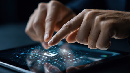A person is using a tablet to touch a screen with a security symbol. The tablet is on a table