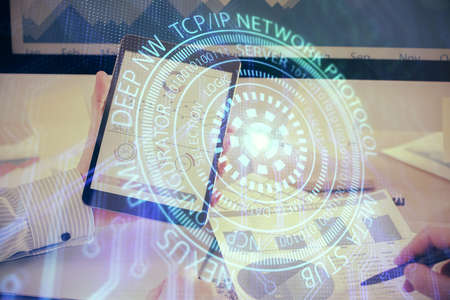 Double exposure of man's hand holding and using a digital device and data theme hologram drawing. Technology concept.