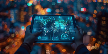 A persons hands hold a tablet displaying a world map with glowing network connections. The background is a blurry cityscape at night.
