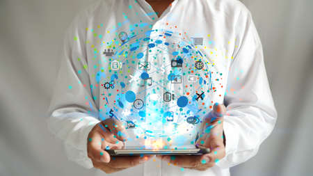 hand holding global network with icons interface on screen, Social media, connect to the future concept.