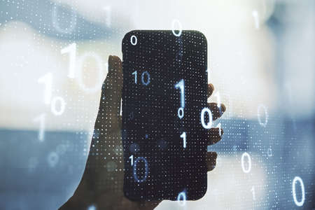 Double exposure of creative abstract binary code hologram and hand with cell phone on background. Database and programming concept