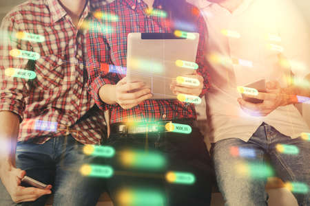 Double exposure of data theme hologram drawing and man and woman working together holding and using a mobile device.