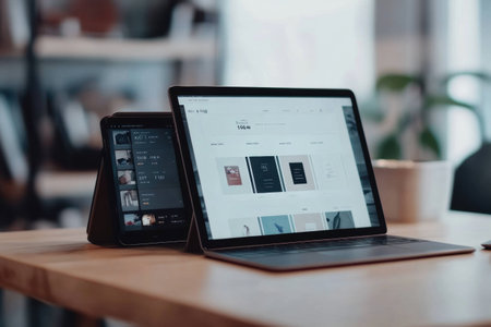A modern workspace featuring multiple laptops and tablets showing vibrant apps on their screens. Perfect for IT companies and electronics manufacturers.