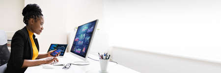 Female prosperous financier holding touch pad with empty mock up copy space screen background for advertising text message while sitting at workstation in office interior. Digital tablet with display