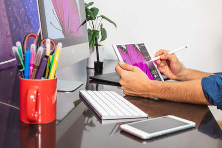 Side view of male designer using digital tablet with stylus pen on white office desk with smartphone, computer device and other supplies