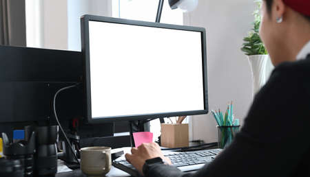 Cropped shot of a young designer sitting at graphic studio in front of computer while working online.