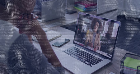 Image conferencing on laptop, person with image of digital wave pattern. Remote working, virtual meeting, technology, communication, connectivity, virtual