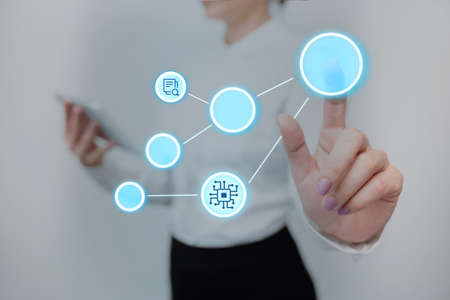 Double exposure of tech icon hologram and woman holding and using a mobile device. Technology concept.