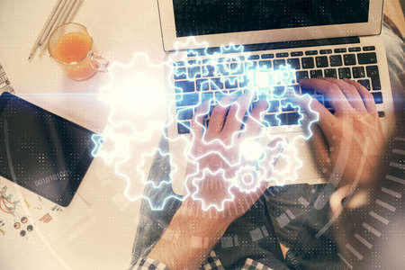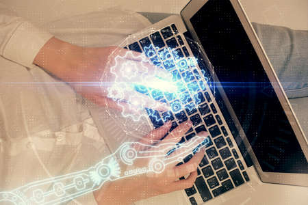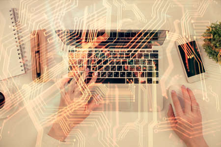 Double exposure of woman hands working on computer and tech theme hologram drawing. Top View. Technology concept.