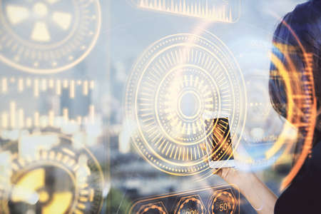 Double exposure of technology theme hologram and cityscape background. Concept of Hightech.