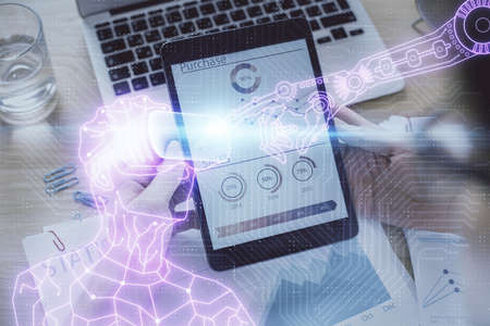 Double exposure of creative artificial Intelligence symbol with finger clicks on a digital tablet on background. Neural networks and machine learning concept