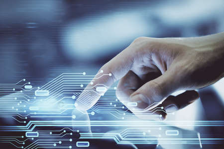 Businessman using fingerprint scan. Fingerprint scan provides access with biometrics identification on the converging point of circuit. Technology, Security and identification concept.