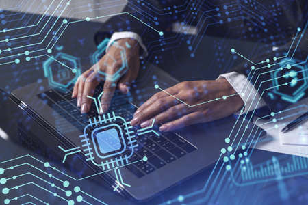 Double exposure of circuit hologram and hands typing on laptop on background. Research and development hardware concept