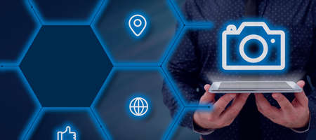 Businessman Holding A Tablet And Projecting A Camera In A Graphic Hexagone Design. Man In A Necktie Presenting Creative Photography And Digital Information.