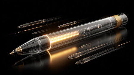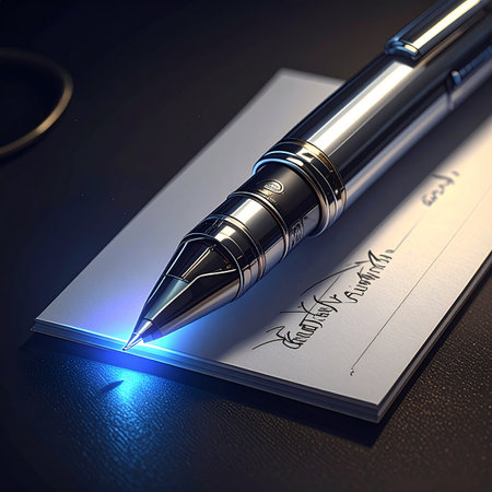 In a dimly lit room, a futuristic pen with an illuminated blue nib hovers over a document.