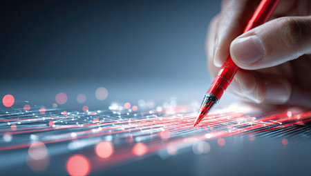 A pen touches a luminous blue surface, illuminating points connected by a network of lines, suggesting innovation and technology. The background glows with soft lights.