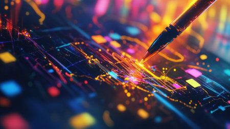 The intricate details of the stylus moving fluidly over a digital surface are emphasized revealing the vibrant colors and textures of a developing illustration while the subtle outlin