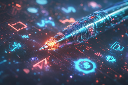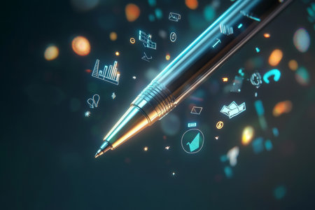 Sleek ballpoint pen with glowing tip surrounded by holographic financial and organizational icons