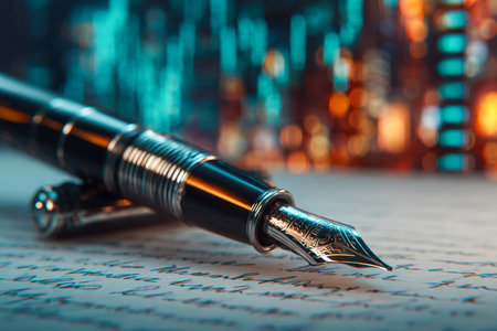A sleek black fountain pen with a detailed nib rests atop handwritten notes, set against a vibrant city skyline blur that inspires artistic reflection.