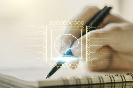 Double exposure of creative human brain microcircuit with man hand writing in notepad on background. Future technology and AI concept